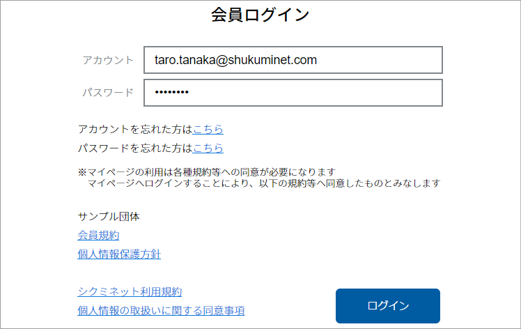 ①『会員ログイン』画面にアクセスし、登録したアカウントにてログインします。