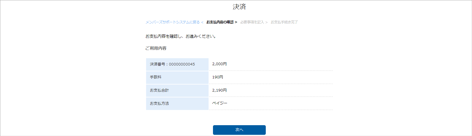 ③お支払い内容を確認し、「次へ」をクリックします。