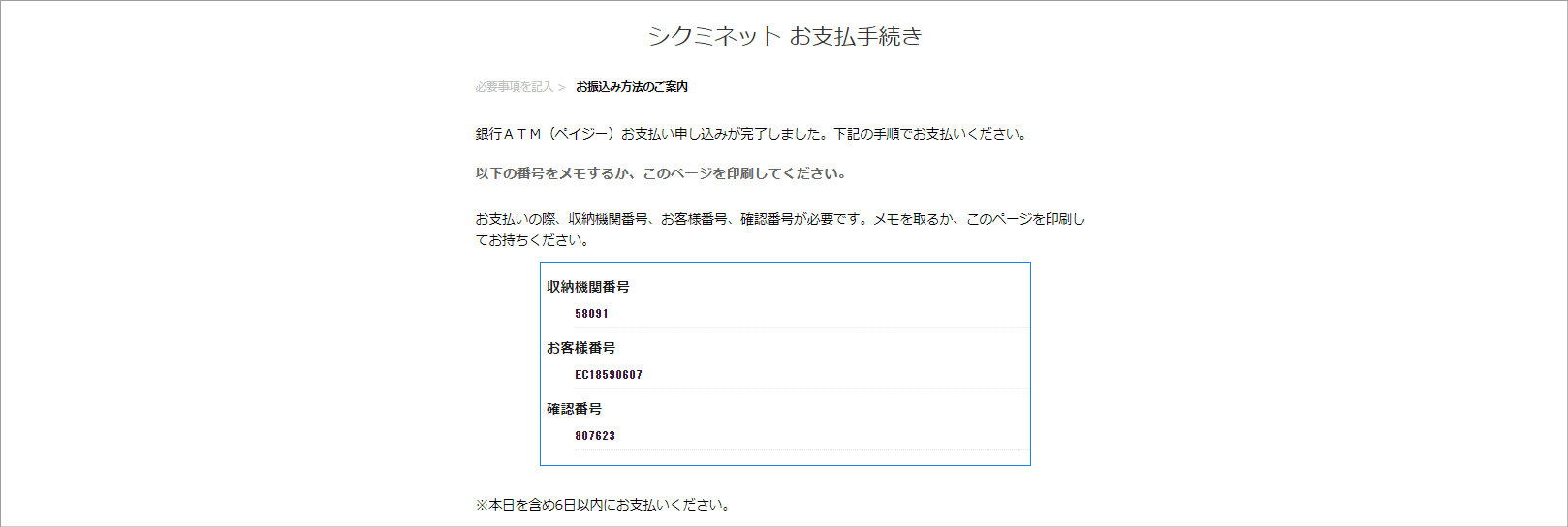 ⑤お支払いに必要な各種番号が表示されます。各種番号はご自身で控えてください。
